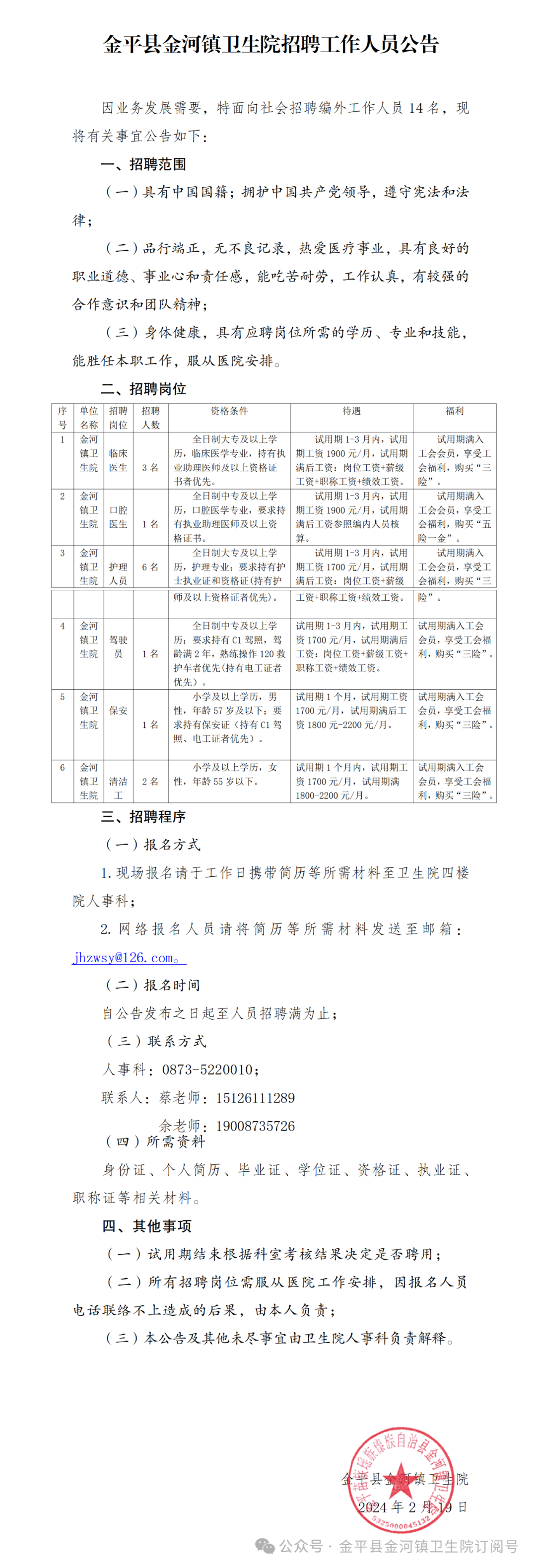 2024年紅河州金平縣金河鎮(zhèn)衛(wèi)生院招聘編外人員公告
