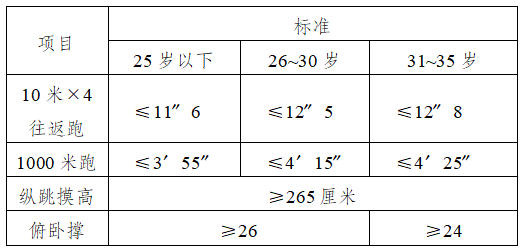 體能測試由10米×4往返跑、縱跳摸高、1000米、俯臥撐四個項(xiàng)目組成,占綜合成績的70%。其標(biāo)準(zhǔn)按照人民法院司法警察基本體能評分標(biāo)準(zhǔn)執(zhí)行。體能測試標(biāo)準(zhǔn)為: