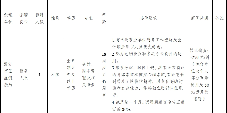 澄江市衛(wèi)健局因工作需要,委托澄江市啟澄人力資源有限責(zé)任公司,面向社會公開招聘財務(wù)人員1名,現(xiàn)將有關(guān)事項(xiàng)公告如下: