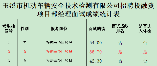 玉溪市機動車輛安全技術檢測有限公司招聘投融資項目部經(jīng)理已于2024年2月23日開考并順利結(jié)束,共3人報名,3人參加面試,擬錄用1人,現(xiàn)將面試成績、進入體檢人員名單及體檢相關事宜公布如下: