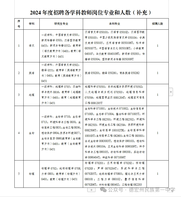 根據(jù)《德宏州人民政府關(guān)于德宏州教育衛(wèi)生部門(mén)考核招聘緊缺專業(yè)學(xué)科優(yōu)秀人才實(shí)施意見(jiàn)的批復(fù)》(德政復(fù)〔2009〕31號(hào))和州委編辦2023-01《關(guān)于同意下屬事業(yè)單位選優(yōu)的批復(fù)》《德宏州人力資源和社會(huì)保障局關(guān)于印發(fā)2024年教育衛(wèi)生部門(mén)考核招聘緊缺專業(yè)學(xué)科優(yōu)秀人才工作方案的通知》(德人社發(fā)〔2024〕2號(hào))文件要求,結(jié)合我校實(shí)際,經(jīng)研究,現(xiàn)將2024年德宏州民族第一中學(xué)考核招聘緊缺專業(yè)學(xué)科優(yōu)秀人才相關(guān)事宜補(bǔ)充公告如下: