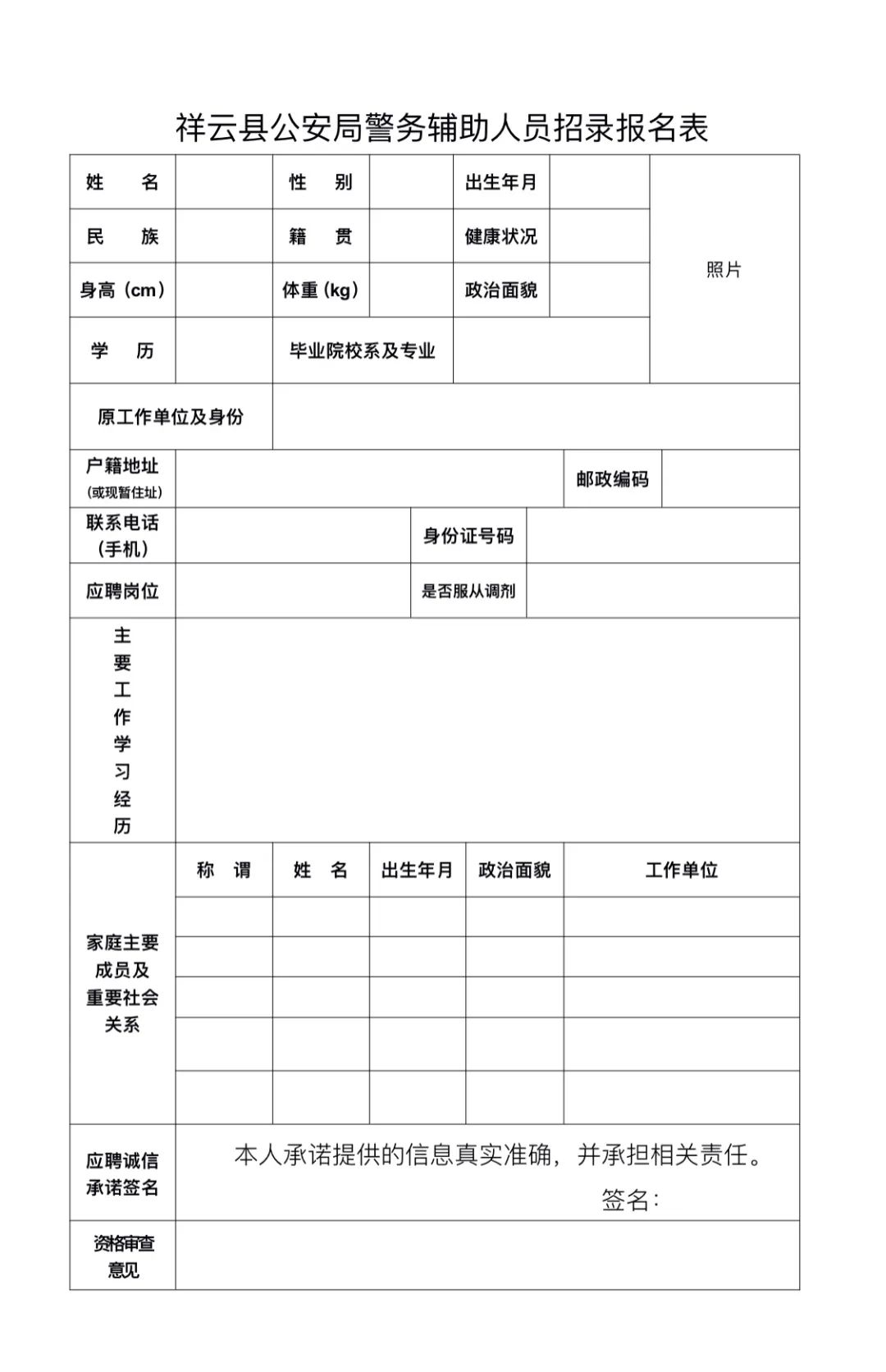 3.報名方式:本次招聘采取本人現(xiàn)場報名形式開展,不接受他人代報,應(yīng)聘人員報名前應(yīng)仔細閱讀招聘公告,真實填報《祥云縣公安局警務(wù)輔助人員招錄報名表》(自行下載報名表)。