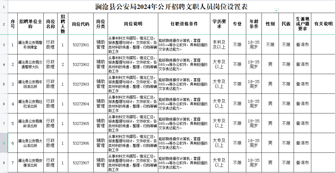 招聘崗位、資格條件詳見《瀾滄縣公安局2024年公開招聘文職人員崗位設(shè)置表》,詳情請(qǐng)關(guān)注“瀾滄警方”微信公眾號(hào)進(jìn)行查詢。