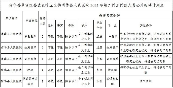 南華縣緊密型縣域醫(yī)療衛(wèi)生共同體縣人民醫(yī)院始建于1941年11月,是全縣唯一一所集醫(yī)療、急救、教學(xué)、科研、保健于一體的二級甲等綜合醫(yī)院。現(xiàn)有開放床位404張,職工504人。為進一步加強南華縣人民醫(yī)院人才隊伍建設(shè),改善人才隊伍結(jié)構(gòu),提高服務(wù)能力,促進衛(wèi)生事業(yè)的可持續(xù)發(fā)展,根據(jù)《楚雄州事業(yè)單位公開招聘工作人員實施意見》(楚人社發(fā)〔2013〕16號),決定面向普通高等醫(yī)學(xué)院校畢業(yè)生招聘專業(yè)技術(shù)人才14名,其中:臨床醫(yī)學(xué)專業(yè)7名,口腔醫(yī)師1名,中醫(yī)2名,護理4名,黨政綜合辦職員1名,共計15名。現(xiàn)將招聘有關(guān)事宜公告如下: