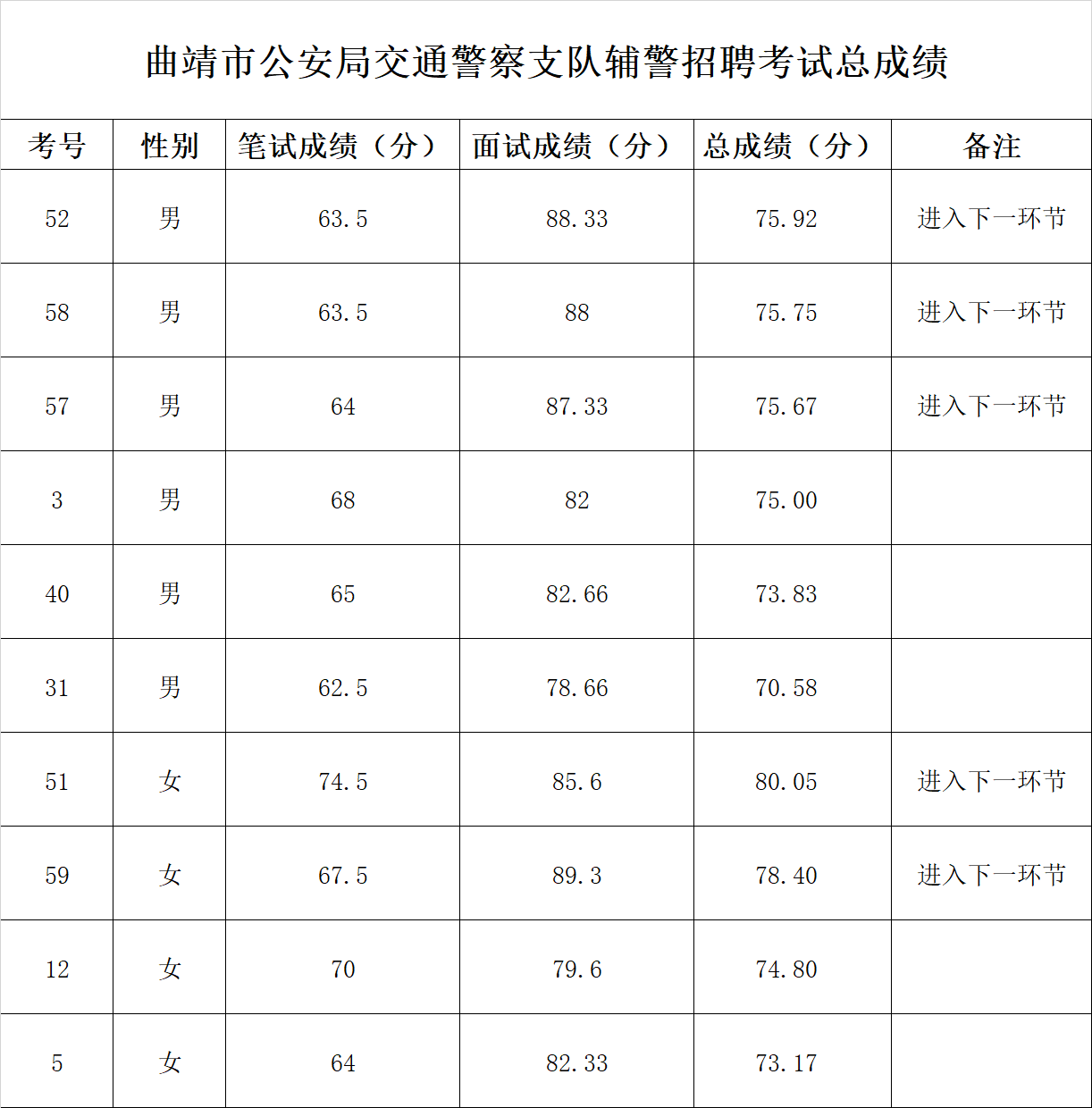 根據(jù)《曲靖市公安局交通警察支隊(duì)關(guān)于公開招聘輔警的公告》規(guī)定,經(jīng)過筆試和面試,現(xiàn)將2024年曲靖市公安局交警支隊(duì)公開招聘輔警總成績予以公布。按總成績由高到低的順序及招聘輔警人數(shù)要求,確定5名考生進(jìn)入下一環(huán)節(jié),請5名考生于4月7日15時(shí)在西關(guān)小學(xué)田徑場(曲靖青少年足球訓(xùn)練基地)集合,組織開展體能測試,逾期不到者視為放棄資格。