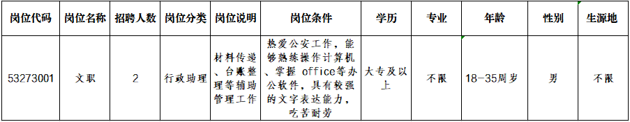 本次招錄共設(shè)1個崗位,男性2人。詳情請關(guān)注“西盟警方”微信公眾號查詢。