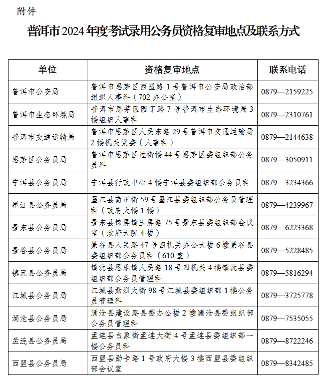 附件:普洱市2024年度考試錄用公務(wù)員資格復(fù)審地點(diǎn)及聯(lián)系方式