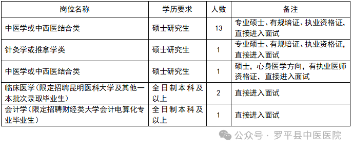 羅平縣中醫(yī)醫(yī)院因業(yè)務(wù)拓展需要,計(jì)劃2024年自主招聘同工同酬編制外中醫(yī)類碩士研究生15名,臨床醫(yī)師2名,會計(jì)師1名,根據(jù)相關(guān)規(guī)定制定如下方案: