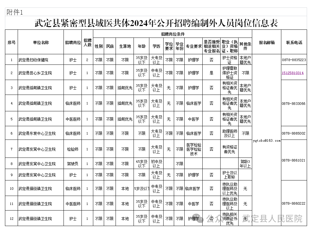 招聘的具體崗位、人數(shù)、資格條件等詳見崗位信息表《武定縣緊密型縣域醫(yī)共體2024年公開招聘編制外人員崗位信息表》(附件1)。