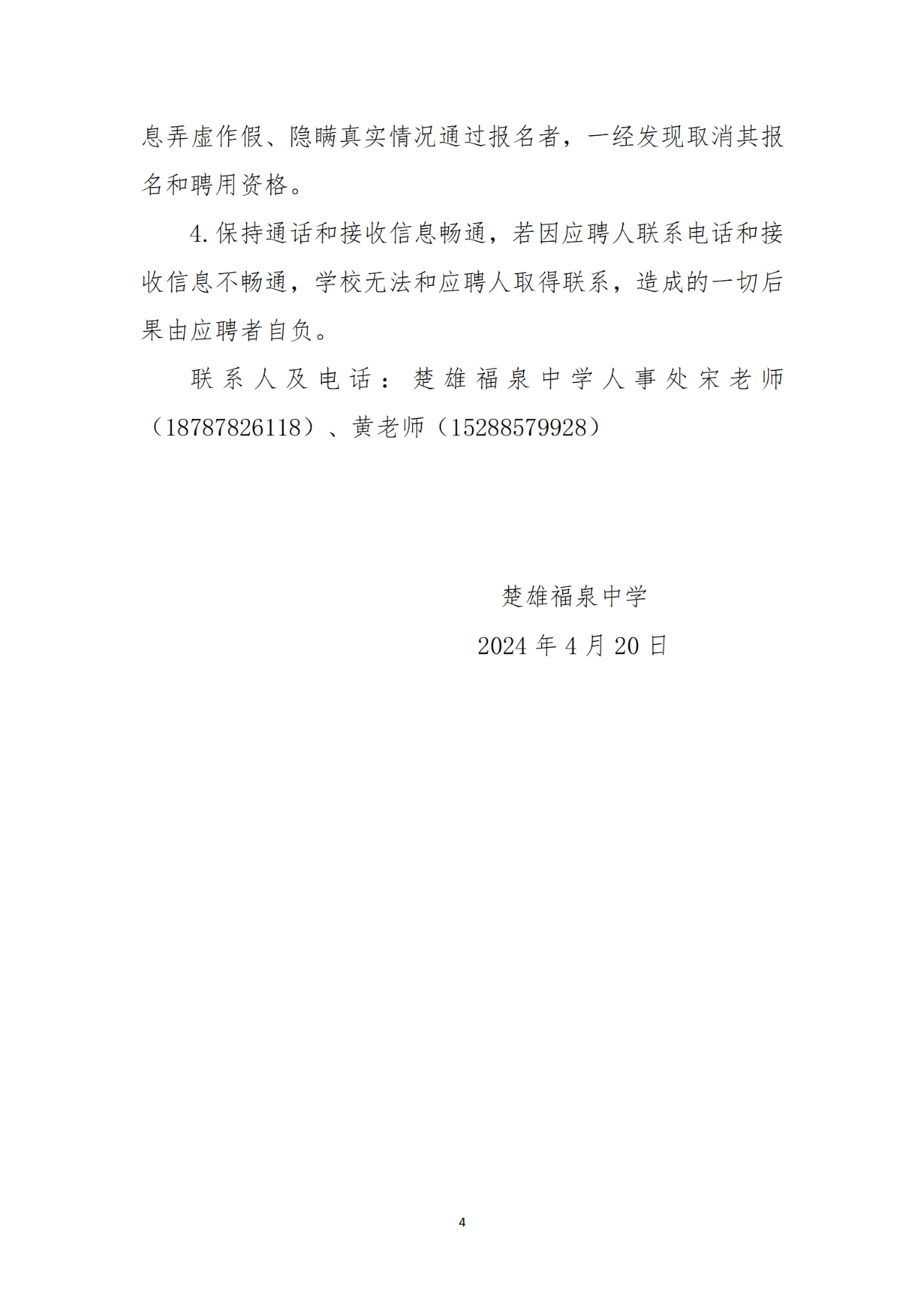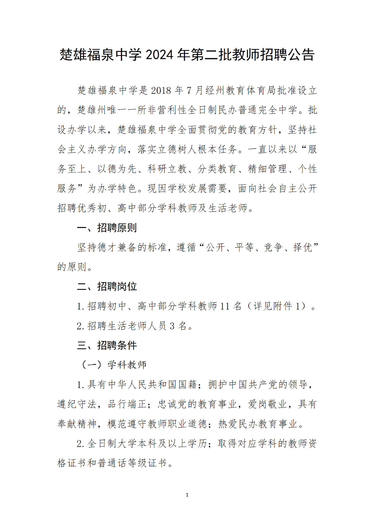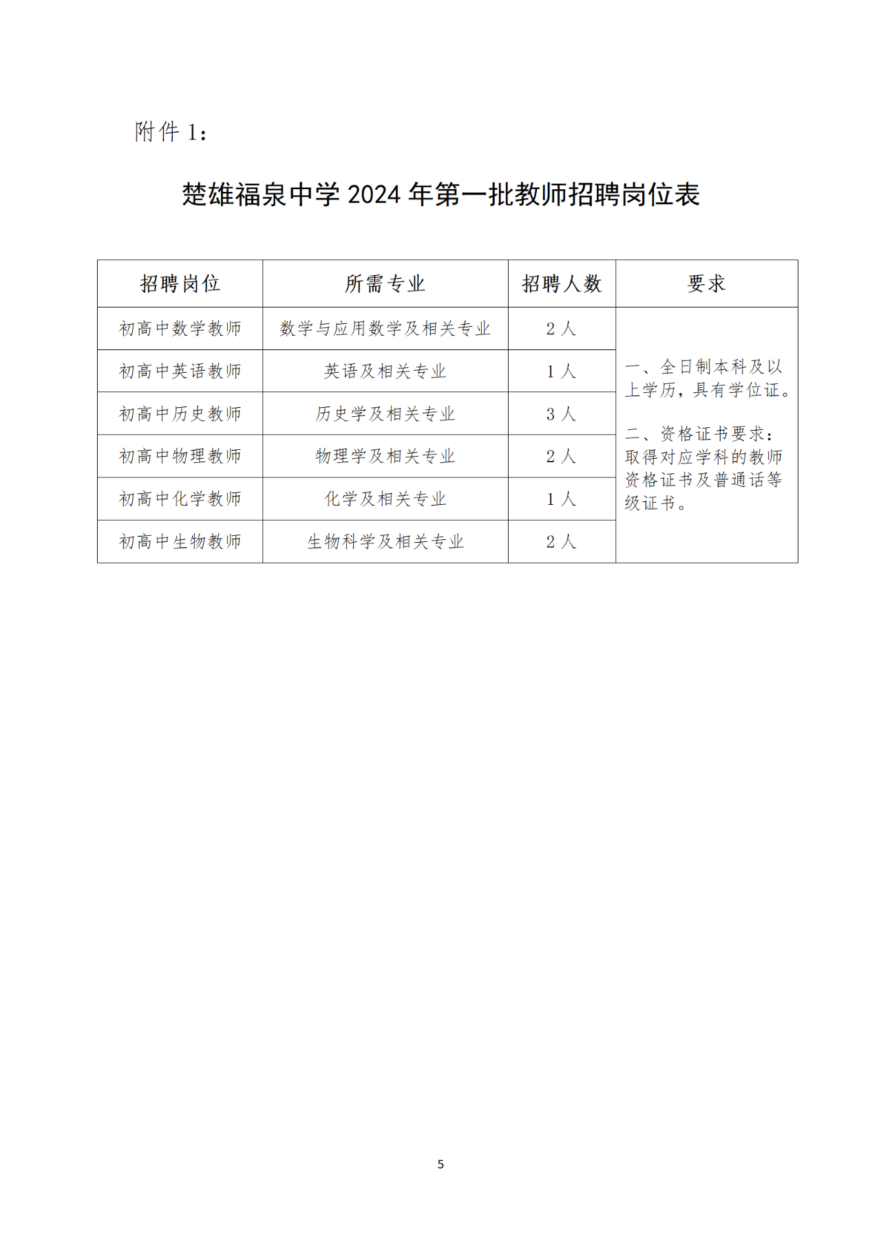 楚雄福泉中學2024年第二批教師招聘公告