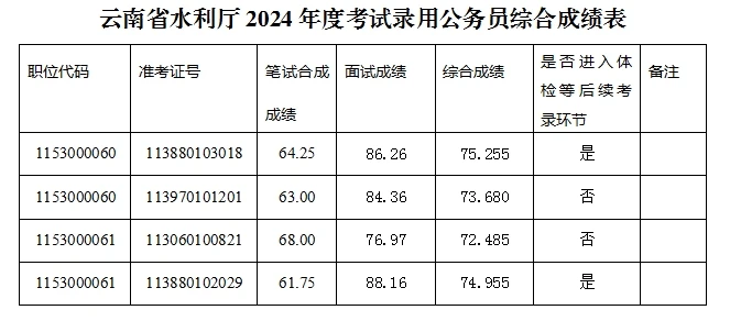 云南省水利廳關(guān)于公布2024年度考試錄用公務(wù)員綜合成績(jī)及后續(xù)工作安排的公告