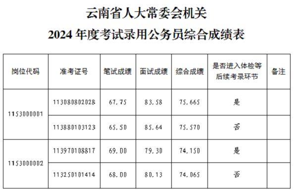 根據(jù)云南省2024年度考試錄用公務(wù)員工作安排,筆試、面試工作已經(jīng)結(jié)束,現(xiàn)將報考云南省人大常委會機(jī)關(guān)公務(wù)員考生綜合成績及后續(xù)工作安排公告如下。
