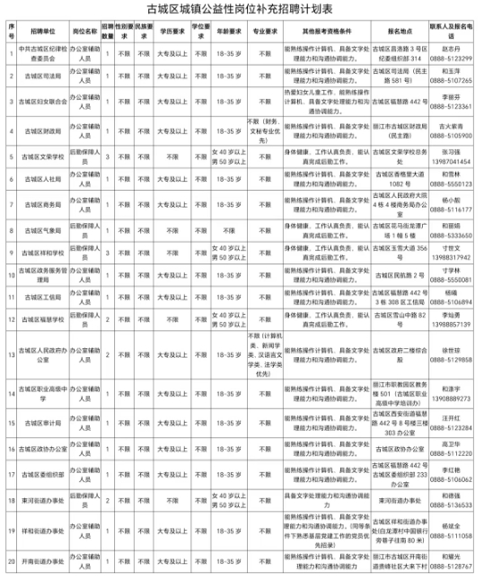 堅(jiān)持“公開(kāi)、公正、平等、擇優(yōu)”的原則,面向麗江市古城區(qū)公開(kāi)招聘公益性崗位人員27名。具體招聘崗位及招聘條件,詳見(jiàn)《古城區(qū)城鎮(zhèn)公益性崗位補(bǔ)充招聘計(jì)劃表》(以下簡(jiǎn)稱《補(bǔ)充招聘計(jì)劃表》)。