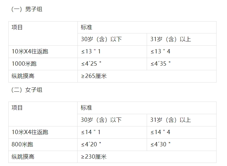 備注:凡應(yīng)測項(xiàng)目中任意一項(xiàng)不達(dá)標(biāo)的,即為體能測評(píng)不合格。