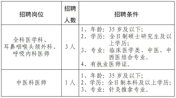 根據(jù)醫(yī)院業(yè)務(wù)發(fā)展需求,現(xiàn)需招聘編外醫(yī)生4人,具體招聘條件如下:
