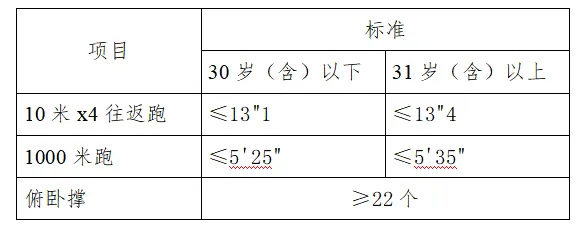 體能測試項目包括:1000米跑、4x10米往返跑,俯臥撐,兩項以上測試達(dá)標(biāo)視為體能合格。
