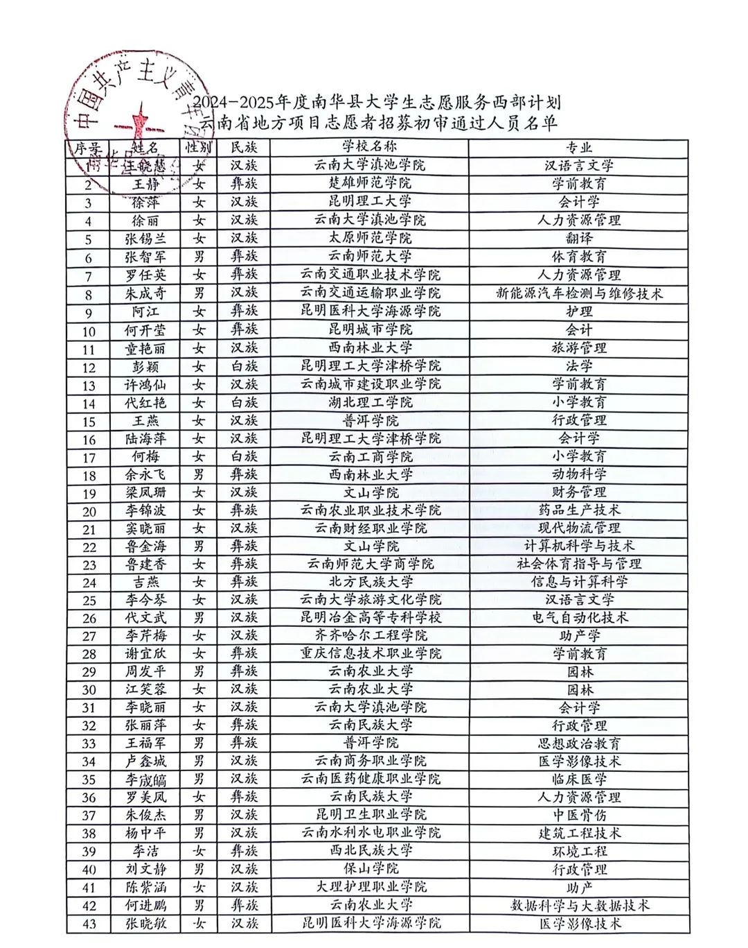 根據(jù)云南省項(xiàng)目辦《關(guān)于做好2024—2025年度云南省大學(xué)生志愿服務(wù)西部計(jì)劃地方項(xiàng)目志愿者招募派遣工作的通知》,南華縣2024-2025年度大學(xué)生志愿服務(wù)西部計(jì)劃志愿者招募報(bào)名工作截止2024年6月10日結(jié)束,經(jīng)縣項(xiàng)目辦審核,共有132人通過(guò)資格審查,現(xiàn)將通過(guò)資格審查的報(bào)名人員名單和筆試有關(guān)事項(xiàng)通知如下: