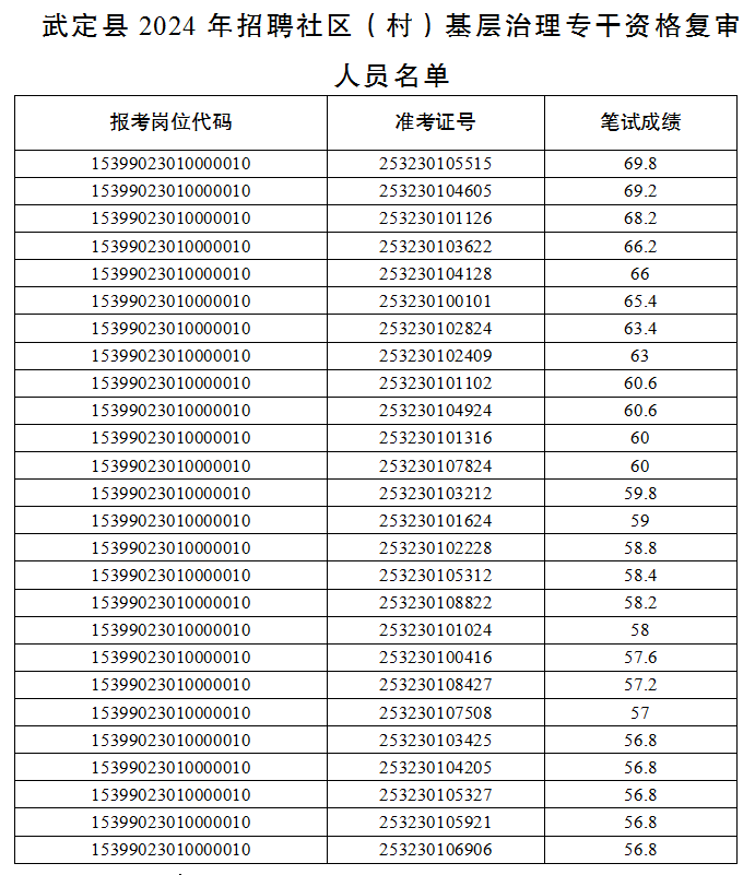 從達(dá)到云南省2024年社區(qū)(村)基層治理專干招聘考試筆試最低合格分?jǐn)?shù)線的考生中,按照筆試成績(jī)從高到低的順序,等額確定參加武定縣2024年社區(qū)(村)基層治理專干招聘資格復(fù)審人員。具體人員名單如下: