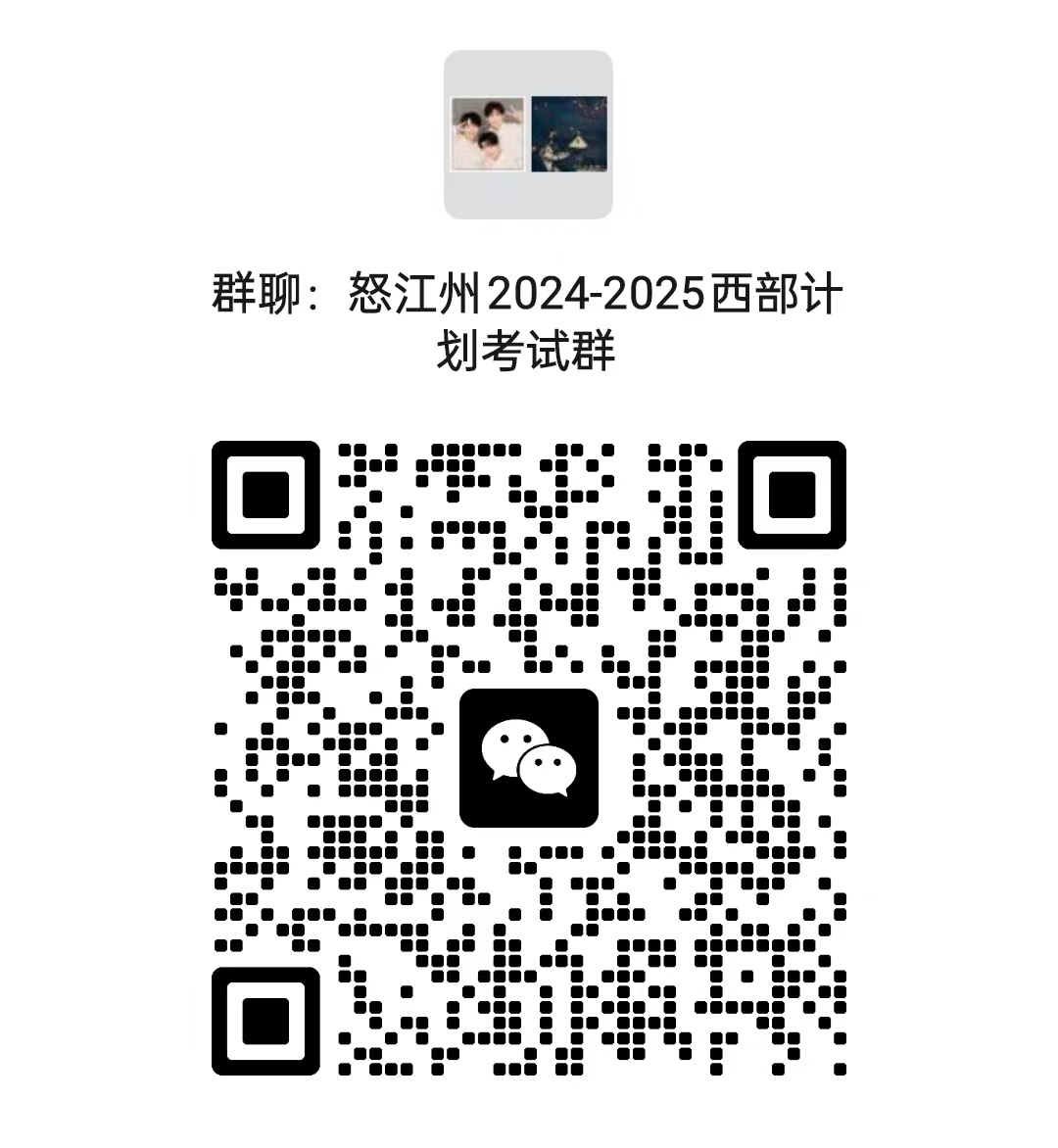 請通過報名審核的考生加入“怒江州2024-2025西部計劃考試群”,并修改備注:姓名+聯(lián)系方式。如果二維碼失效,無法加群,請及時聯(lián)系州項目辦。