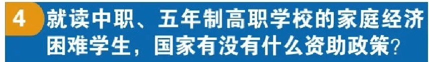 答:對就讀中職、五年制高職院校的全日制在校家庭經(jīng)濟(jì)困難學(xué)生,前三年按照中職學(xué)校的資助政策執(zhí)行。可申請國家獎學(xué)金、省政府獎學(xué)金、國家助學(xué)金和免學(xué)費。