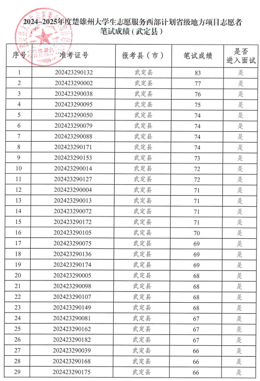 根據共青團云南省委、云南省教育廳、云南省財政廳、云南省人力資源和社會保障廳《關于印發(fā)〈2024—2025年度云南省大學生志愿服務西部計劃實施方案〉的通知》和云南省大學生志愿服務西部計劃項目管理辦公室《關于做好2024—2025年度云南省大學生志愿服務西部計劃地方項目志愿者招募派遣工作的通知》要求,武定縣2024—2025年度計劃招錄大學生志愿服務西部計劃省級地方項目志愿者17名。全縣通過報名資格審核186人,縣項目辦于2024年6月22日下午組織開展了志愿者筆試,現(xiàn)對筆試成績予以公告。
