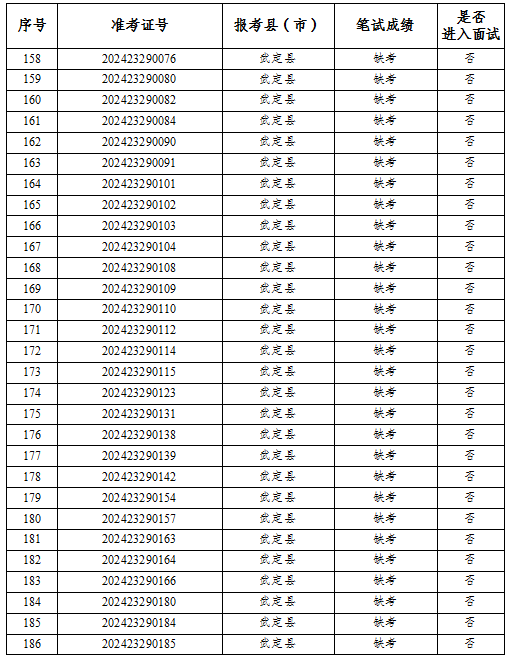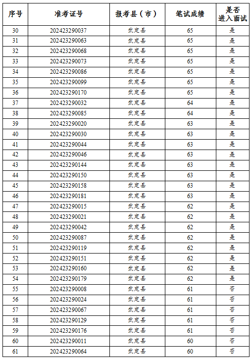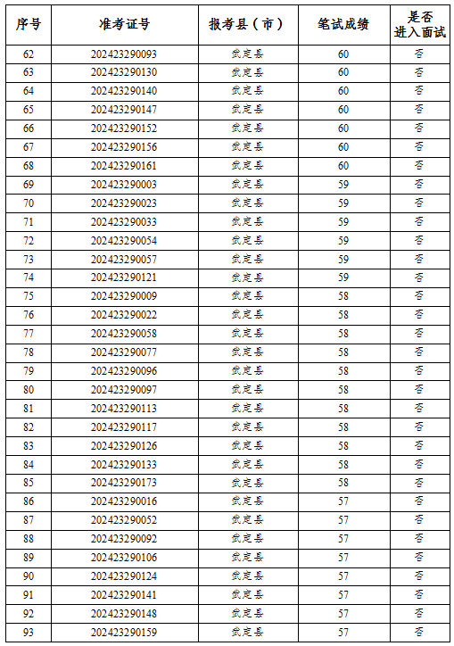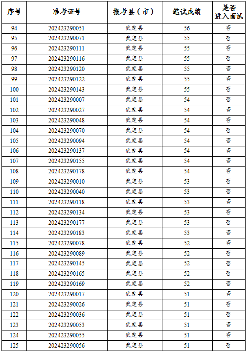 公示時間為2024年6月25日至6月27日,如考生對筆試成績有異疑,請于公示期內向楚雄州項目辦書面提交查分申請(含報考縣市、姓名、準考證號及考生聯(lián)系電話)。若公示無異議則根據成績從高到低按照1:3的比例確定前54名考生進行資格復審,資格復審合格的考生領取面試通知書。