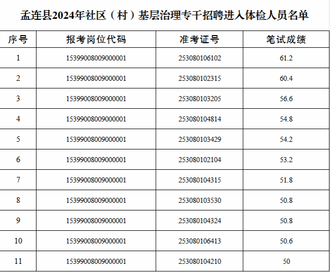 (三)參加體檢人員:報(bào)考孟連縣2024年社區(qū)(村)基層治理專干、符合《云南省2024年社區(qū)(村)基層治理專干招聘公告》規(guī)定的通過(guò)資格復(fù)審的人員。(詳見(jiàn)附件)