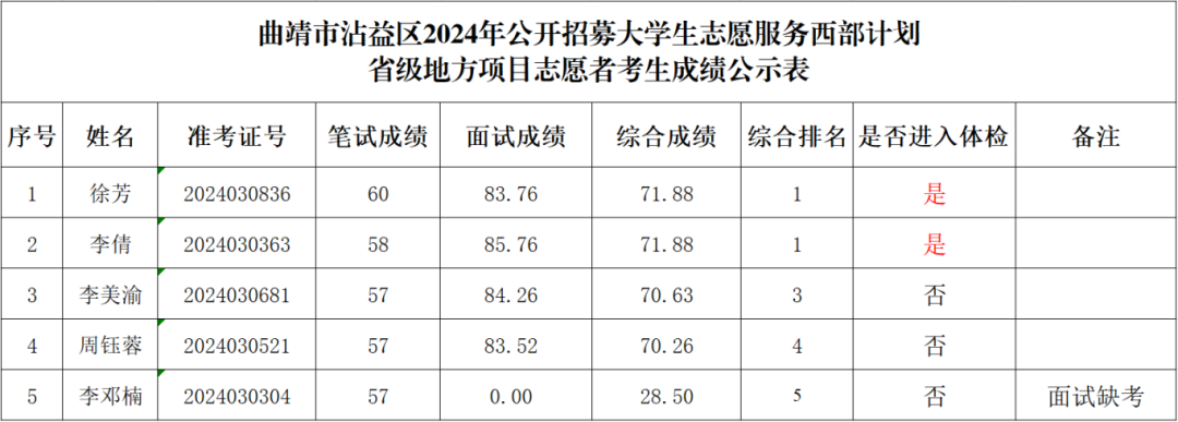 根據(jù)《關(guān)于做好2024—2025年度云南省大學(xué)生志愿服務(wù)西部計(jì)劃地方項(xiàng)目志愿者招募派遣工作的通知》精神及《2024年西部計(jì)劃云南省地方項(xiàng)目志愿者招募公告》《云南省曲靖市關(guān)于2024年大學(xué)生志愿服務(wù)西部計(jì)劃地方項(xiàng)目志愿者招募的公告》有關(guān)規(guī)定和要求,曲靖市沾益區(qū)項(xiàng)目辦于2024年6月28日上午組織了大學(xué)生志愿服務(wù)西部計(jì)劃省級(jí)地方項(xiàng)目志愿者面試,現(xiàn)將曲靖市沾益區(qū)2024年招募大學(xué)生志愿服務(wù)西部計(jì)劃省級(jí)地方項(xiàng)目志愿者面試成績(jī)、綜合成績(jī)及擬進(jìn)入體檢人員名單進(jìn)行公示。