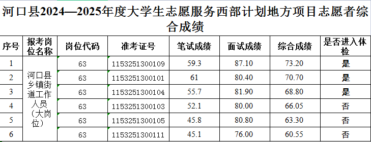根據(jù)《紅河州2024—2025年度大學(xué)生志愿服務(wù)西部計(jì)劃地方項(xiàng)目志愿者招募公告》工作安排,共青團(tuán)河口縣委于2024年6月28日順利完成大學(xué)生志愿者面試招募工作。此次面試遵循公平、公正、公開的原則,堅(jiān)決把規(guī)矩和紀(jì)律放在首位,從報名及資格審查、筆試、面試等環(huán)節(jié)都嚴(yán)格把關(guān),科學(xué)制定面試實(shí)施方案。現(xiàn)將綜合成績及體檢名單公示如下: