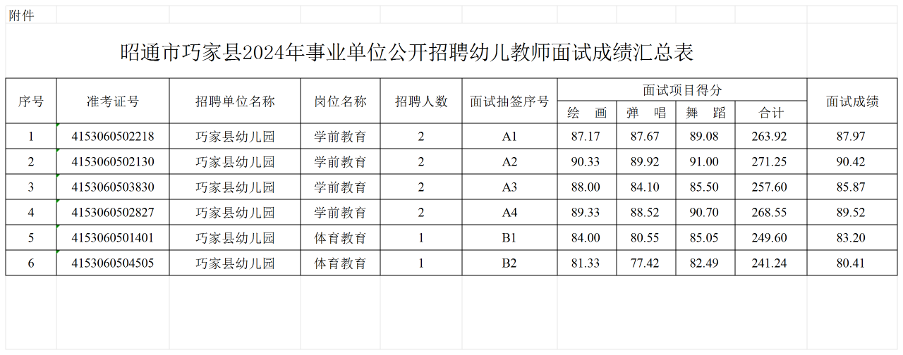 根據(jù)《昭通市2024年事業(yè)單位公開招聘工作人員通告(第一號(hào))》《昭通市2024年事業(yè)單位公開招聘幼兒教師面試通告》,昭通市巧家縣2024年事業(yè)單位公開招聘幼兒教師面試工作已完成,現(xiàn)將面試成績(jī)公示如下。公示時(shí)間為3個(gè)工作日,若有異議,請(qǐng)聯(lián)系巧家縣教育體育局人事股,聯(lián)系電話:0870-7127016。