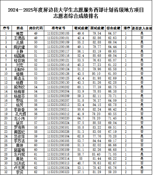 根據(jù)《紅河州2024—2025年度大學(xué)生志愿服務(wù)西部計(jì)劃地方項(xiàng)目志愿者招募公告》工作安排,屏邊縣大學(xué)生志愿服務(wù)西部計(jì)劃項(xiàng)目管理辦公室遵循公平、公正、公開的原則,于2024年6月28日順利完成面試工作。現(xiàn)將綜合成績(jī)及擬進(jìn)入體檢人員名單予以公示,公示時(shí)間從2024年6月29日起至7月3日止。
