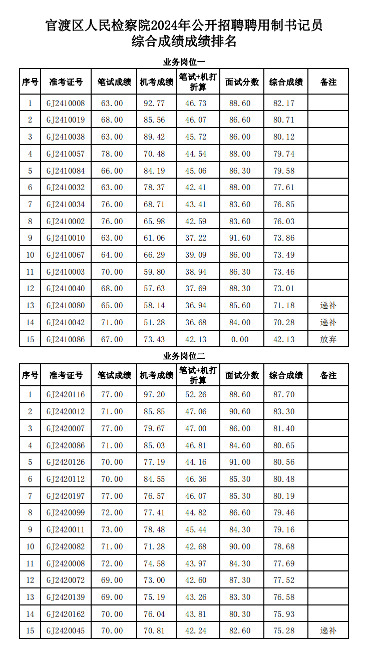 昆明市官渡區(qū)人民檢察院公開招聘聘用制書記員面試成績(jī)已于25日公示,根據(jù)相關(guān)規(guī)定和要求,現(xiàn)將考生綜合成績(jī)及入圍體檢人員名單公告如下。