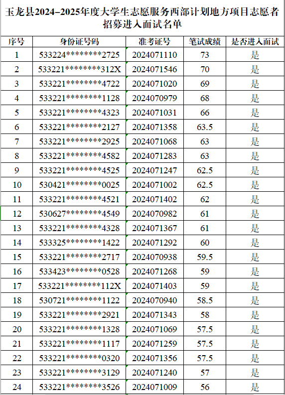附件:玉龍縣2024—2025年度大學(xué)生志愿服務(wù)西部計(jì)劃地方項(xiàng)目招募進(jìn)入面試名單