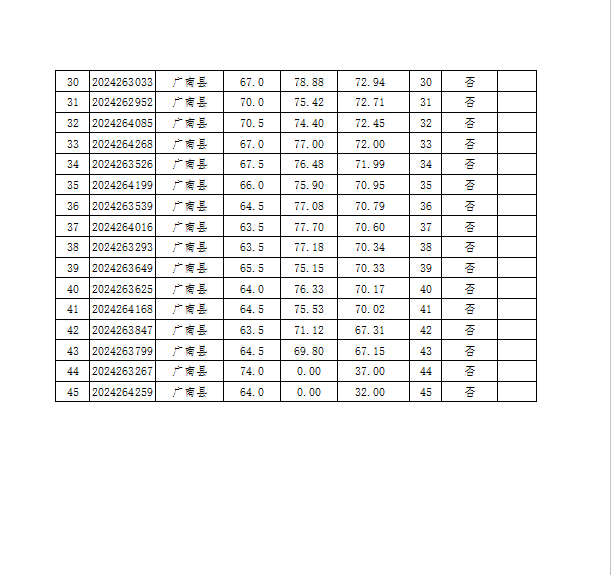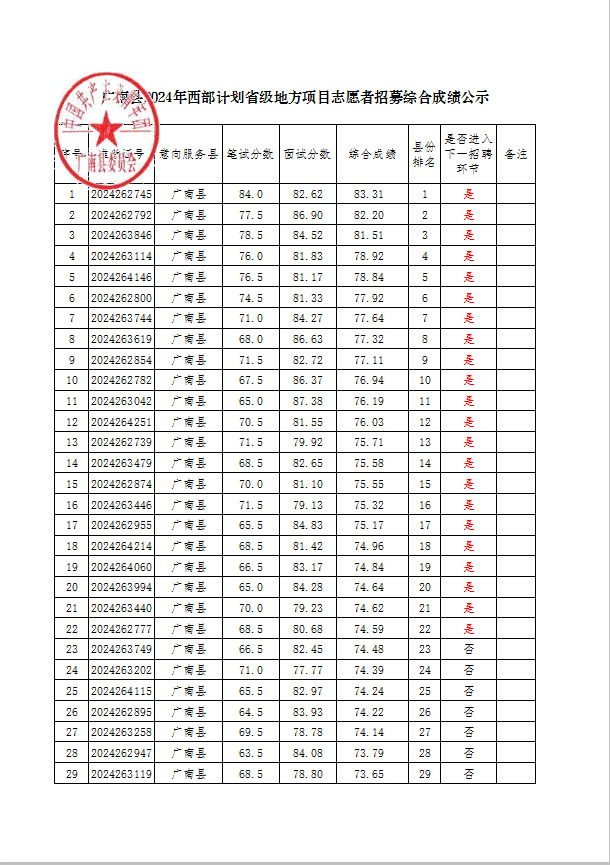 根據(jù)廣南縣2024—2025年度大學(xué)生志愿服務(wù)西部計(jì)劃省級(jí)地方項(xiàng)目志愿者招募程序和《關(guān)于做好2024—2025年度云南省大學(xué)生志愿者服務(wù)西部計(jì)劃地方項(xiàng)目志愿者招募派遣工作的通知》《關(guān)于做好文山州2024—2025年度西部計(jì)劃省級(jí)地方項(xiàng)目志愿者招募工作的通知》文件要求,廣南縣項(xiàng)目辦于2024年7月2日組織開(kāi)展相關(guān)面試工作,現(xiàn)將廣南縣2024年招募大學(xué)生志愿服務(wù)西部計(jì)劃省級(jí)地方項(xiàng)目志愿者綜合成績(jī)進(jìn)行公示。