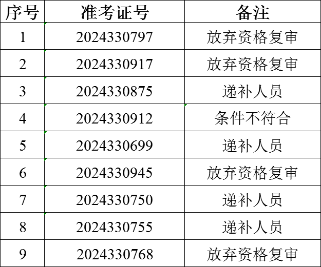 根據(jù)怒江州大學(xué)生志愿服務(wù)西部計(jì)劃項(xiàng)目管理辦公室關(guān)于做好怒江新招募大學(xué)生志愿服務(wù)西部計(jì)劃省級(jí)地方項(xiàng)目志愿者面試及后續(xù)錄用工作的要求,對(duì)瀘水市2024—2025年度大學(xué)生志愿服務(wù)西部計(jì)劃地方項(xiàng)目招募資格復(fù)審期間,因考生放棄等原因出現(xiàn)缺額,擬從報(bào)考瀘水崗位的考生中,按筆試成績(jī)從高到低的順序依次遞補(bǔ)參加資格復(fù)審確認(rèn)。現(xiàn)將遞補(bǔ)人員名單公布如下:
