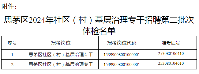 思茅區(qū)2024年社區(qū)(村)基層治理專干招聘第二批次體檢名單(詳見附件)。