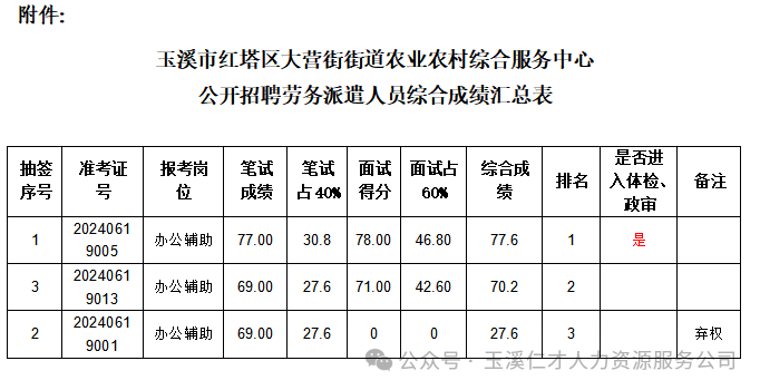 根據(jù)《玉溪市紅塔區(qū)大營(yíng)街街道農(nóng)業(yè)農(nóng)村綜合服務(wù)中心公開招聘勞務(wù)派遣人員公告》,筆試成績(jī)按1:3的比例確定面試人員。2024年7月4日上午9:00進(jìn)行面試,實(shí)際參加面試人數(shù)3名(1名棄權(quán))。現(xiàn)將面試成績(jī)予以公示。并根據(jù)《玉溪市紅塔區(qū)大營(yíng)街街道農(nóng)業(yè)農(nóng)村綜合服務(wù)中心公開招聘勞務(wù)派遣人員公告》,將進(jìn)入下一環(huán)節(jié)--體檢政審人員名單進(jìn)行公示,公示期共3天,自2024年7月5日至7月7日。公示期間如有問題、意見、建議,請(qǐng)?jiān)谏鲜鲆?guī)定時(shí)間內(nèi)(上午8:30-11:30,下午14:30-17:30)致電:13312652030(王老師)。