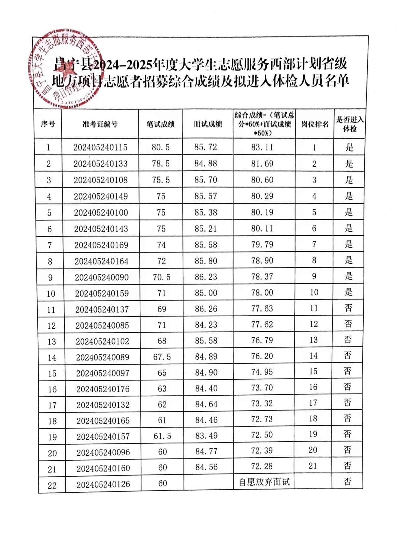 根據(jù)昌寧縣2024—2025年度大學(xué)生志愿服務(wù)西部計(jì)劃省級(jí)地方項(xiàng)目志愿者招募工作安排。7月4日,昌寧縣項(xiàng)目辦統(tǒng)一組織面試,根據(jù)考生筆試成績(jī)從高分到低分的順序按照崗位1︰2的比例確定面試人員,經(jīng)過(guò)補(bǔ)錄共22人進(jìn)入面試,棄考1人,實(shí)際參加面試21人。現(xiàn)將綜合成績(jī)及擬進(jìn)入體檢人員名單予以公示。