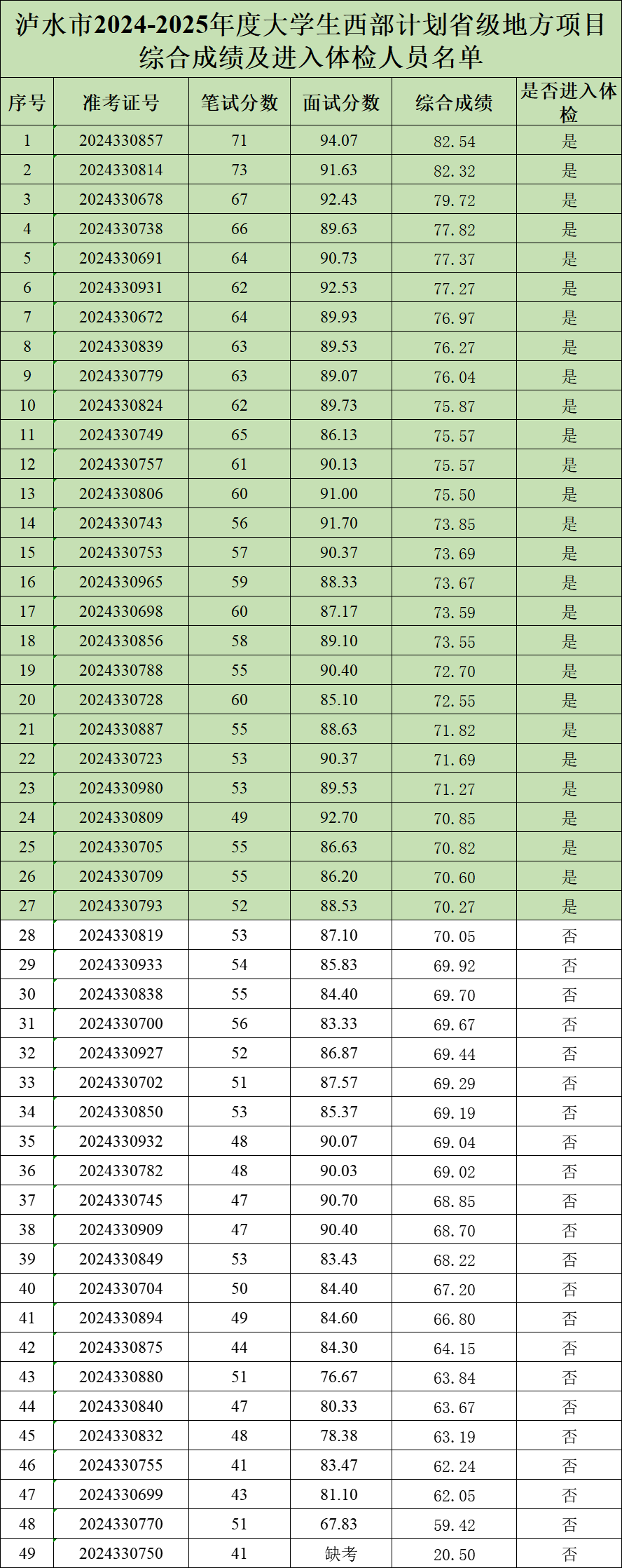 根據(jù)瀘水市西部計(jì)劃志愿者招募程序,瀘水市大學(xué)生西部計(jì)劃項(xiàng)目管理辦公室已于2024年7月4日舉行公開面試,為確保下一步招錄工作順利開展,現(xiàn)將瀘水市省級(jí)地方項(xiàng)目志愿者綜合成績公布如下: