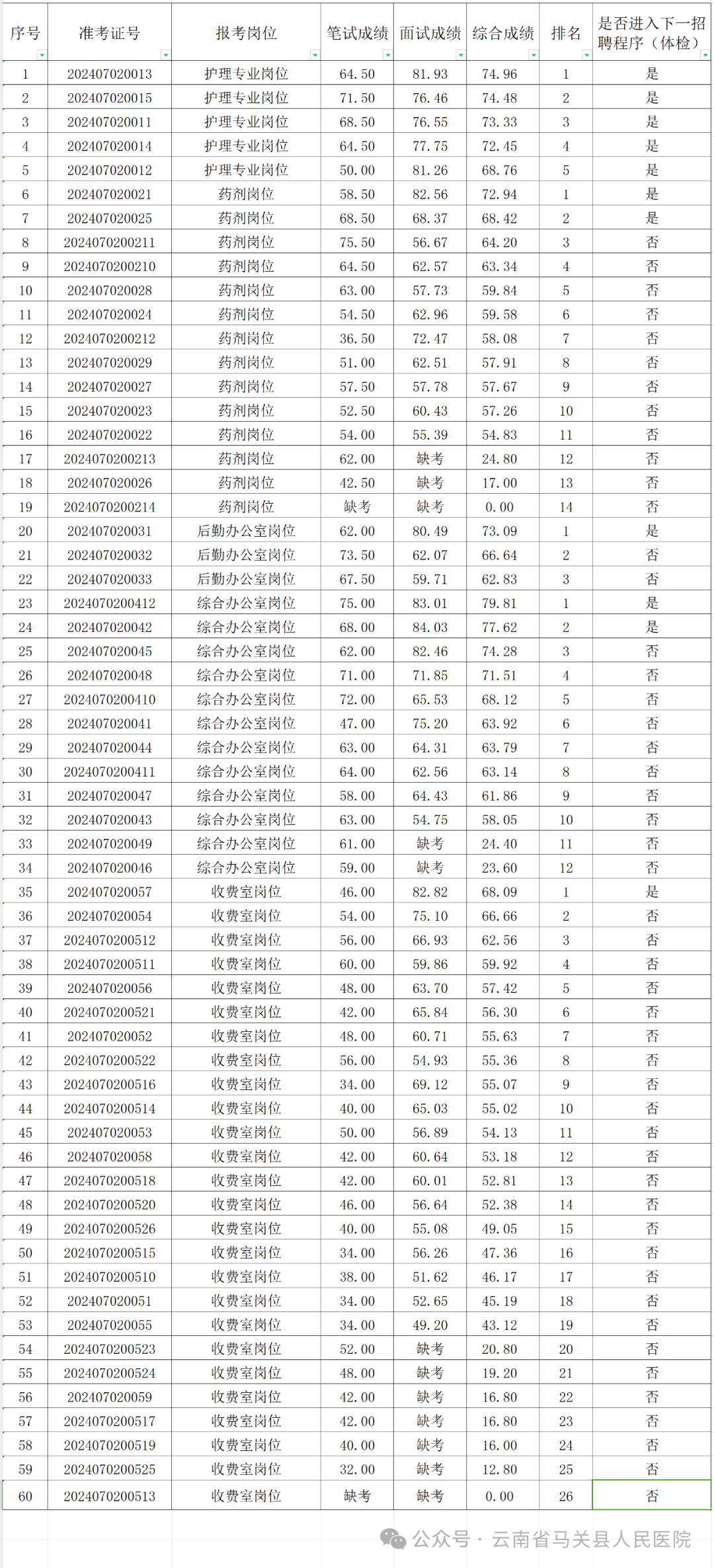 根據(jù)《馬關(guān)縣人民醫(yī)院2024年編外合同職工招聘公告》要求,我院按照程序于2024年7月2日對(duì)報(bào)考人員進(jìn)行了筆試,2024年7月4日和2024年7月5日進(jìn)行了面試,現(xiàn)將考試成績(jī)予以公示如下: