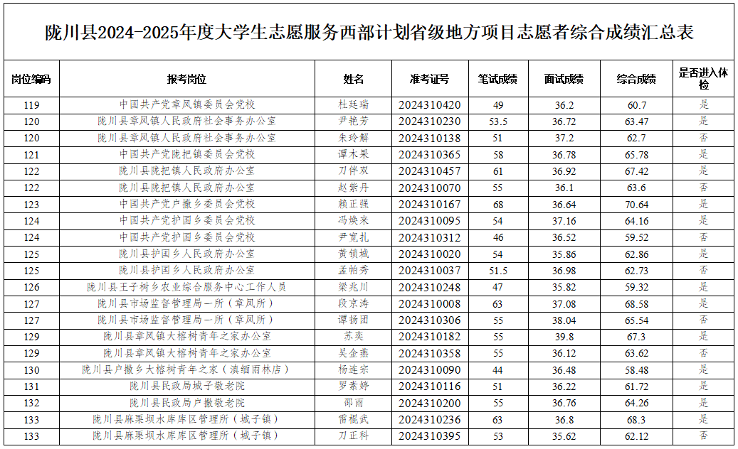 隴川縣2024-2025年度大學(xué)生志愿服務(wù)西部計(jì)劃省級(jí)地方項(xiàng)目志愿者面試工作于7月5日順利舉行。此次面試按照“公平公開(kāi)公正”的原則,采用結(jié)構(gòu)化面試方式,重點(diǎn)對(duì)考生組織協(xié)調(diào)、語(yǔ)言表達(dá)、志愿者服務(wù)認(rèn)知和舉止儀表等方面進(jìn)行了全面考核。現(xiàn)將成績(jī)公布如下: