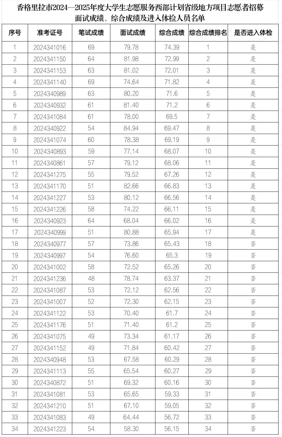 香格里拉市2024—2025年度大學(xué)生志愿服務(wù)西部計(jì)劃省級(jí)地方項(xiàng)目志愿者招募面試工作已于7月13日結(jié)束,根據(jù)《2024-2025年度迪慶州大學(xué)生志愿服務(wù)西部計(jì)劃省級(jí)地方項(xiàng)目志愿者招募公告》,現(xiàn)將香格里拉市2024—2025年度大學(xué)生志愿服務(wù)西部計(jì)劃省級(jí)地方項(xiàng)目志愿者招募面試成績(jī)、綜合成績(jī)及進(jìn)入體檢人員進(jìn)行公示,公示期為7月14日—7月16日,若考生對(duì)面試成績(jī)、綜合成績(jī)存在疑問(wèn),可在公示期內(nèi)到香格里拉市項(xiàng)目辦(香格里拉市行政中心1-6-08)書(shū)面反映,公示期結(jié)束后提出的一律不予受理。
