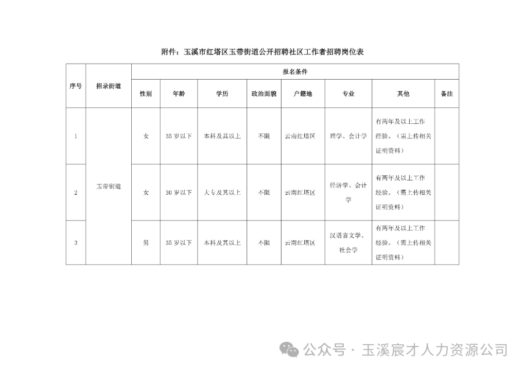 因工作需要,玉溪市紅塔區(qū)玉帶街道委托玉溪宸才人力資源咨詢管理有限公司面向社會公開招聘社區(qū)工作者5名,現(xiàn)將有關(guān)事項公告如下: