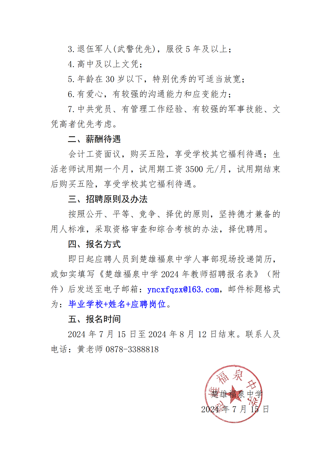 楚雄福泉中學(xué)2024年財務(wù)人員及生活教師招聘公告