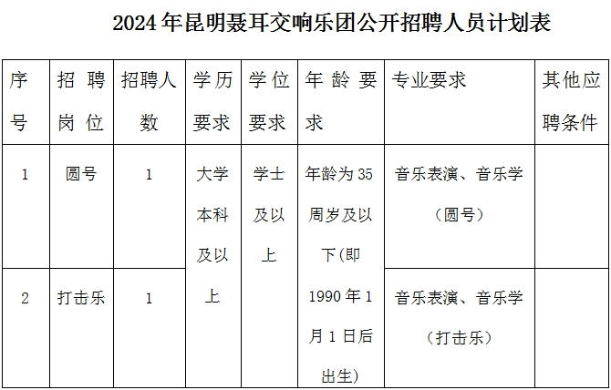 本次公開招聘崗位為專業(yè)技術崗,共招聘演奏員2名。其中,圓號1名、打擊樂1名。具體招聘崗位及招聘條件,詳見《2024年昆明聶耳交響樂團第二批公開招聘人員計劃表》(附件1)。本次招聘崗位不占用單位事業(yè)編制,用工形式為勞務派遣。