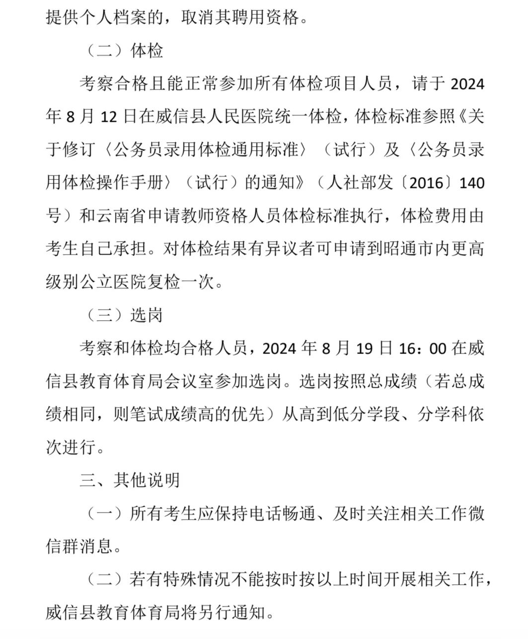 威信縣教育體育局 關(guān)于2024年中央特崗教師招聘面試成績及后續(xù)相關(guān)工作的通告