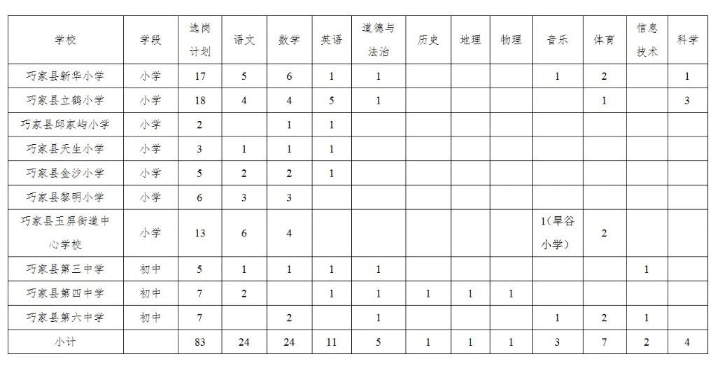此次公開選崗崗位83個,各學段各學科崗位計劃如下: