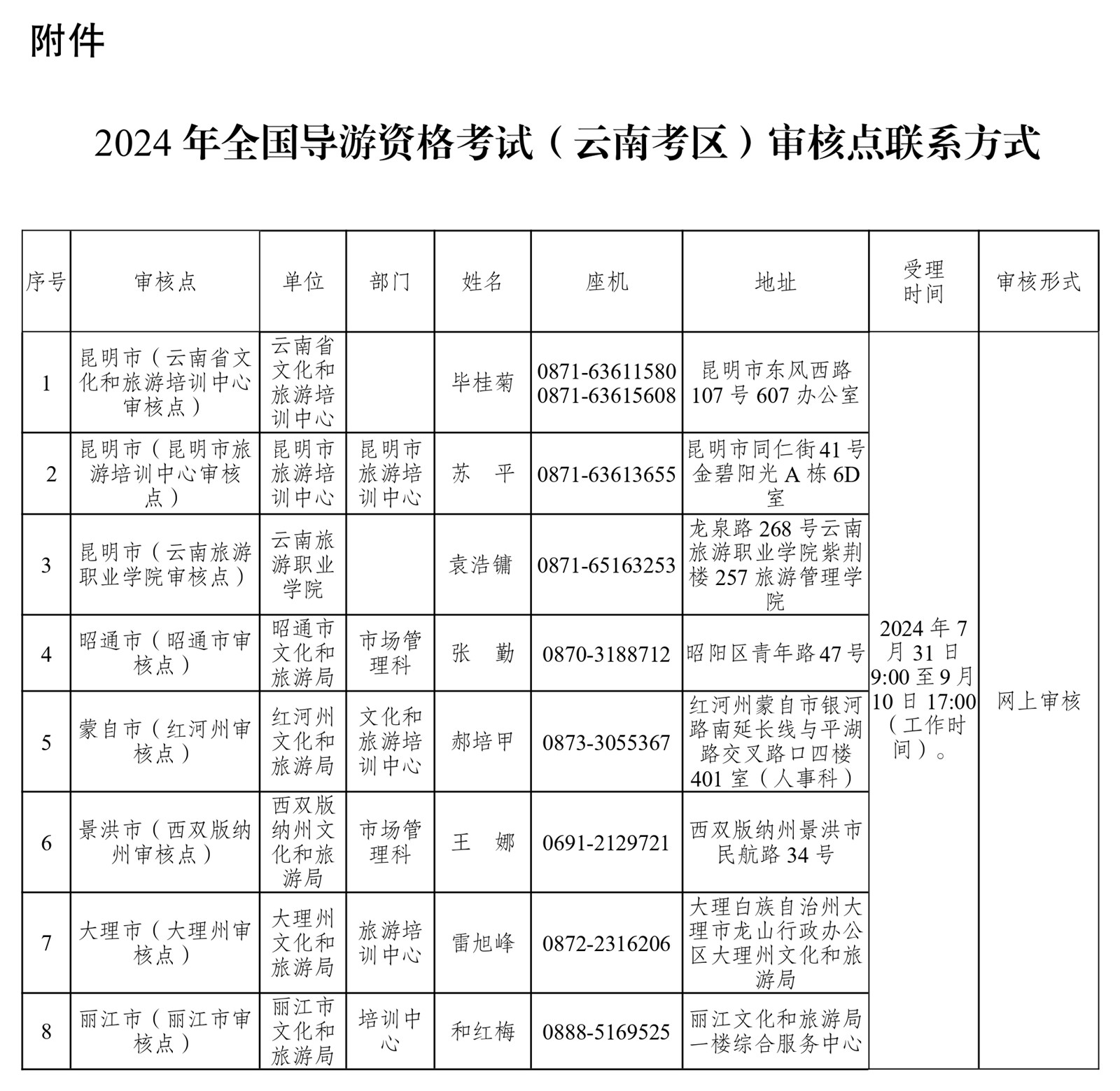 附件:2024年全國導(dǎo)游資格考試(云南考區(qū))審核點聯(lián)系方式