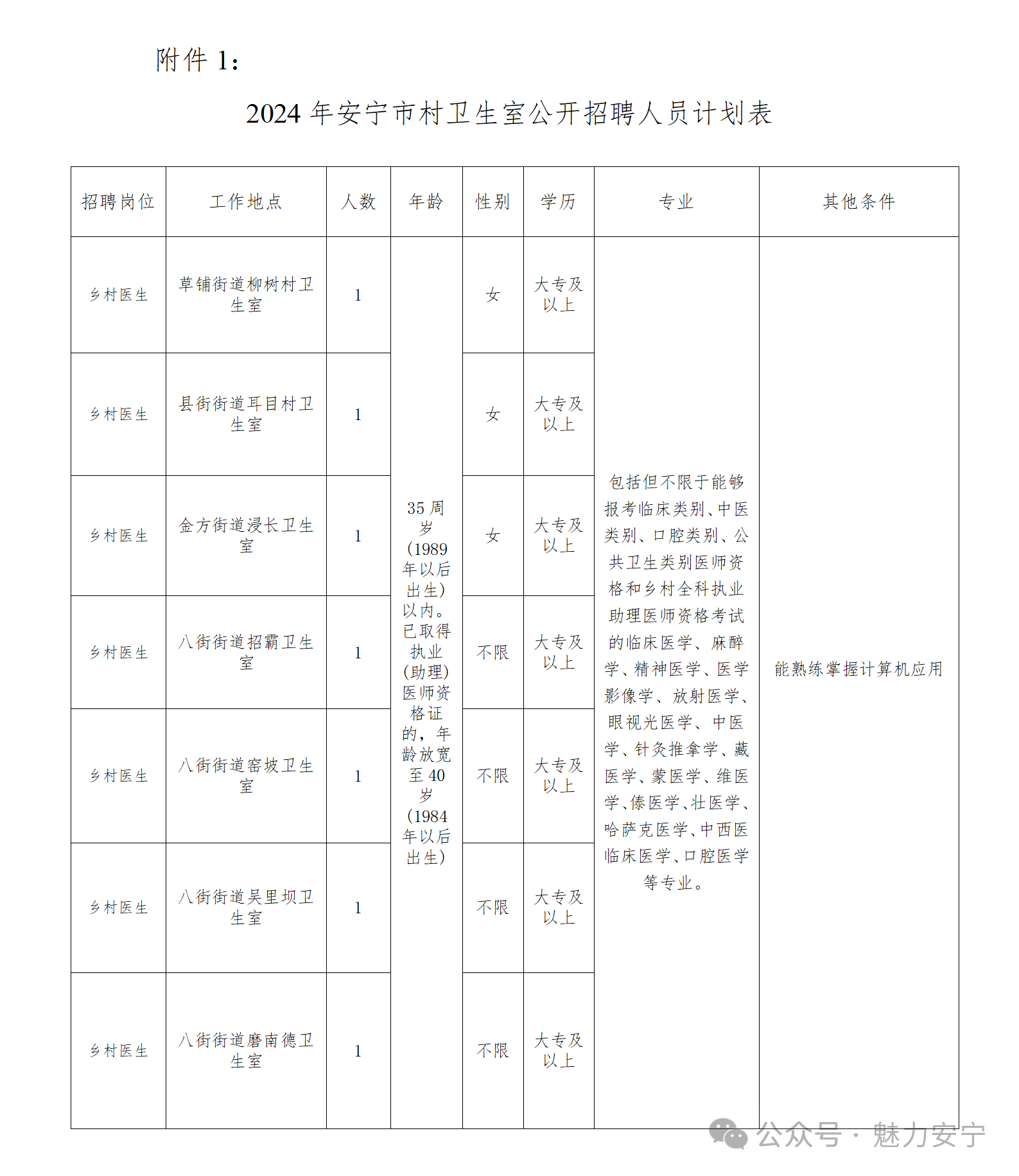 7.具備擬報(bào)考崗位所要求的其他條件,具體詳見(jiàn)《2024年安寧市村衛(wèi)生室公開(kāi)招聘人員計(jì)劃表》。