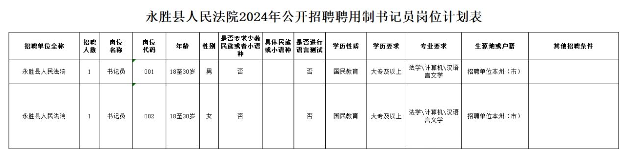 《永勝縣人民法院2024年公開招聘聘用制書記員計劃表》